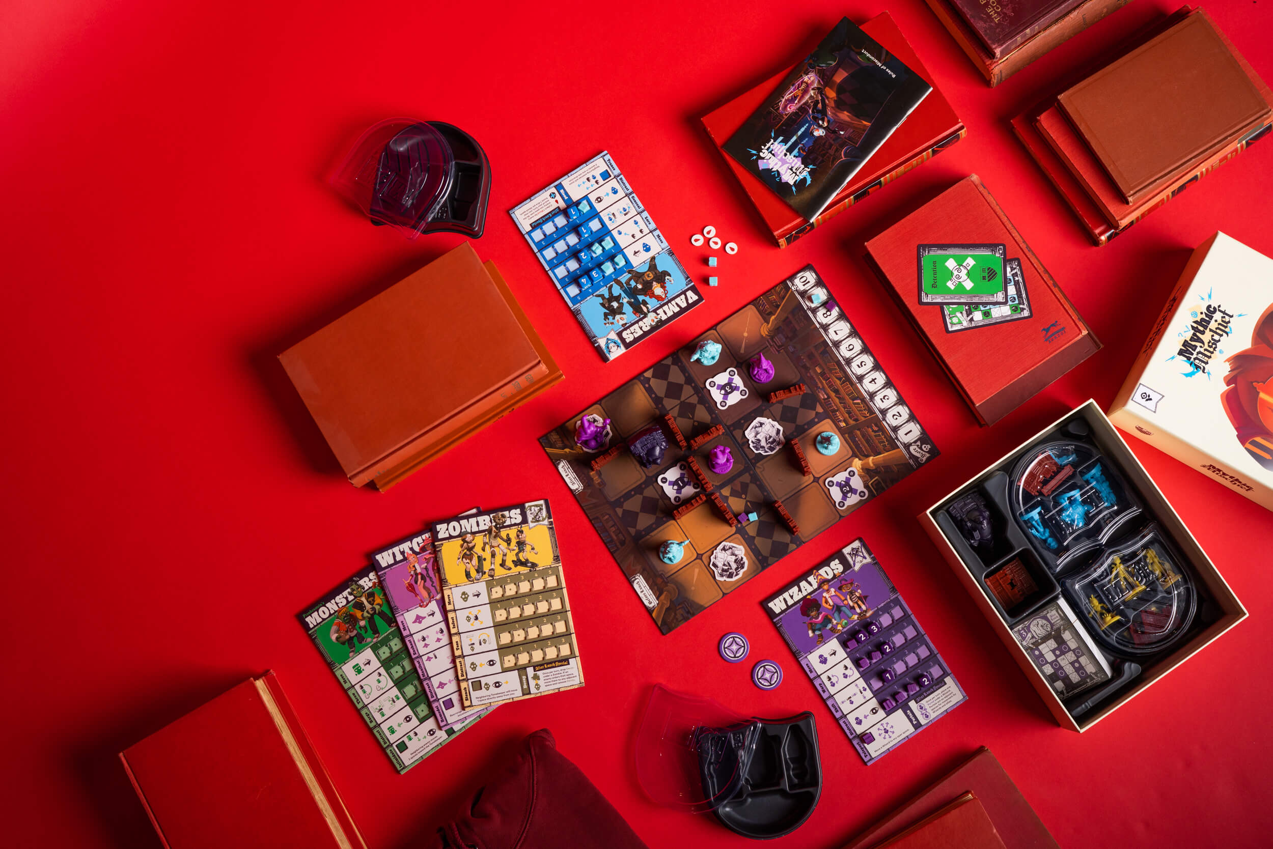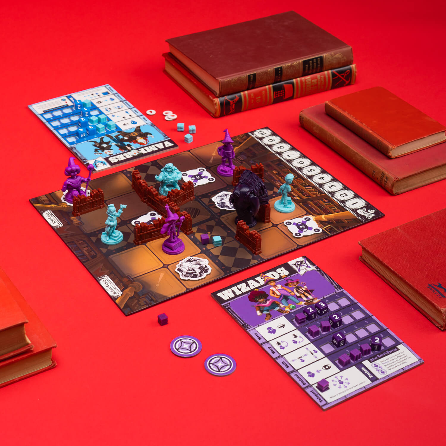 The colorful player miniatures, bookshelves, and upgrade tomes keep gameplay organized.