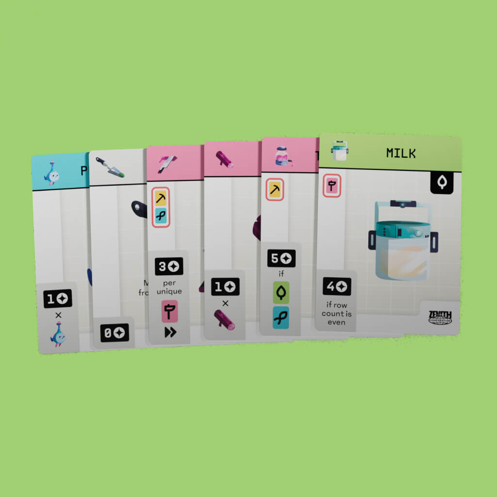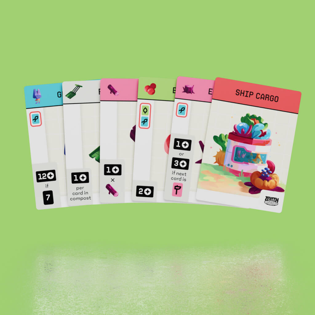Each card has a scoring condition in the bottom left. Finding the right combos of cards will score big!