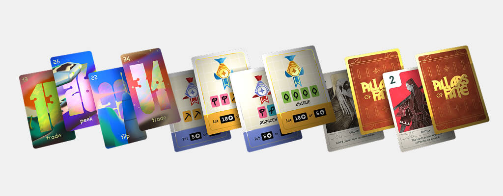 Holofoil, gold foil, UV Printing, and more. Each game includes a special design feature on its cards.