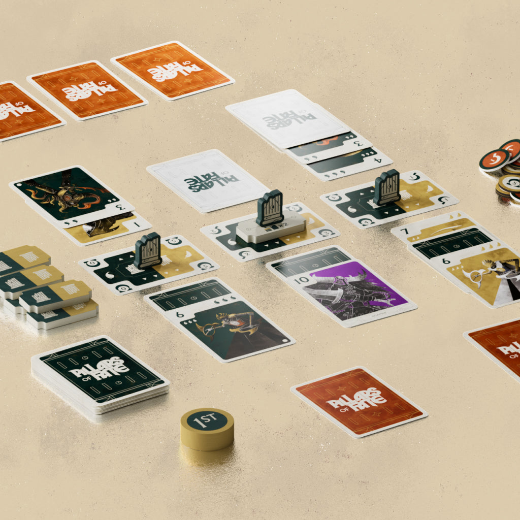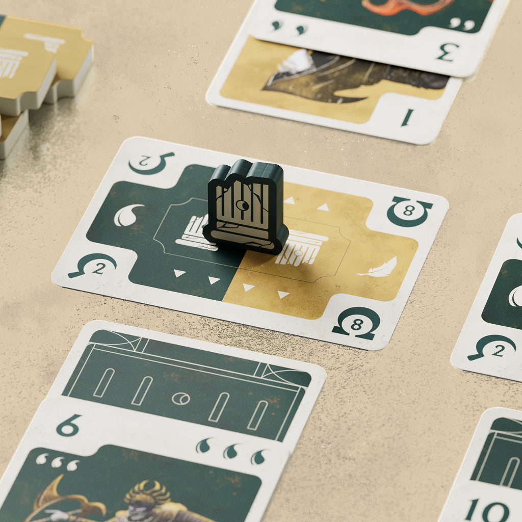 In Pillars of Fate, 2 players compete across three ages, deploying mortal champions and divine beings to claim legendary quests. Each age unfolds as players take turns strategically playing cards into three quest lanes, where battles are won through either the path of Feathers or Scorpions. Victory isn’t just about winning—it’s about how you win. The dominant suit in each lane determines the battle’s rewards, meaning the victor may walk away with satisfaction or possibly fewer points than expected. To deepen the intrigue, players may place one card face down per lane, keeping their true intentions hidden. Is it a powerful reinforcement or the perfect trap? Additionally, divine beings bring special asymmetric abilities that can drastically shift the tide of battle, adding another layer of strategy. Can you control the fate of the quests and earn the most renown at the end of the 3 ages?