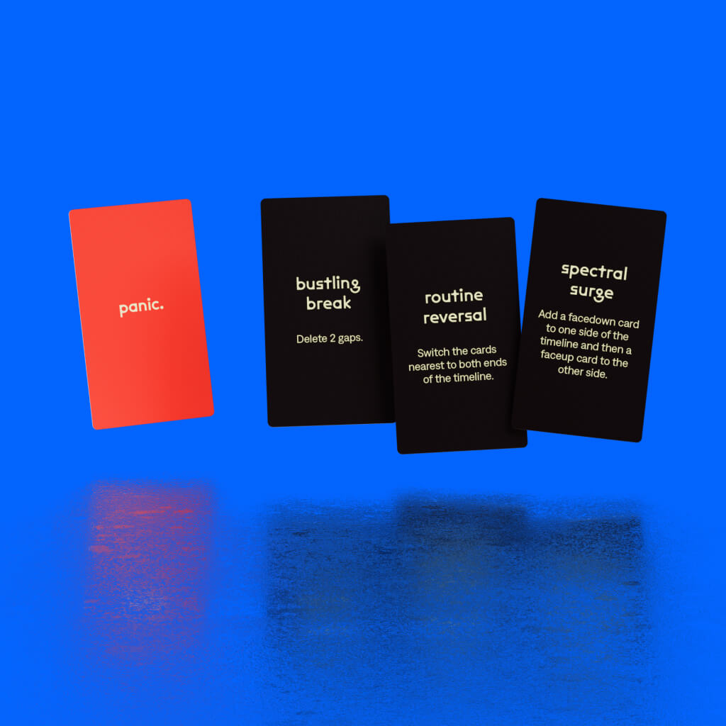 A catastrophic anomaly has shattered the fabric of time, leaving history in disarray. Your team—an elite group of multiversal agents—must work together to repair the timeline before it’s too late. By carefully manipulating events back in to chronological order, you will restore balance to reality. On each turn, you will place a card back into the time line and activate its ability. Then draw a new panic card to resolve, sowing extra chaos in the game. The fewer mistakes you make, the better your final score. A perfect game results in a completely accurate timeline with no misplaced events. But beware, if too many events are misplaced, history may be lost forever.