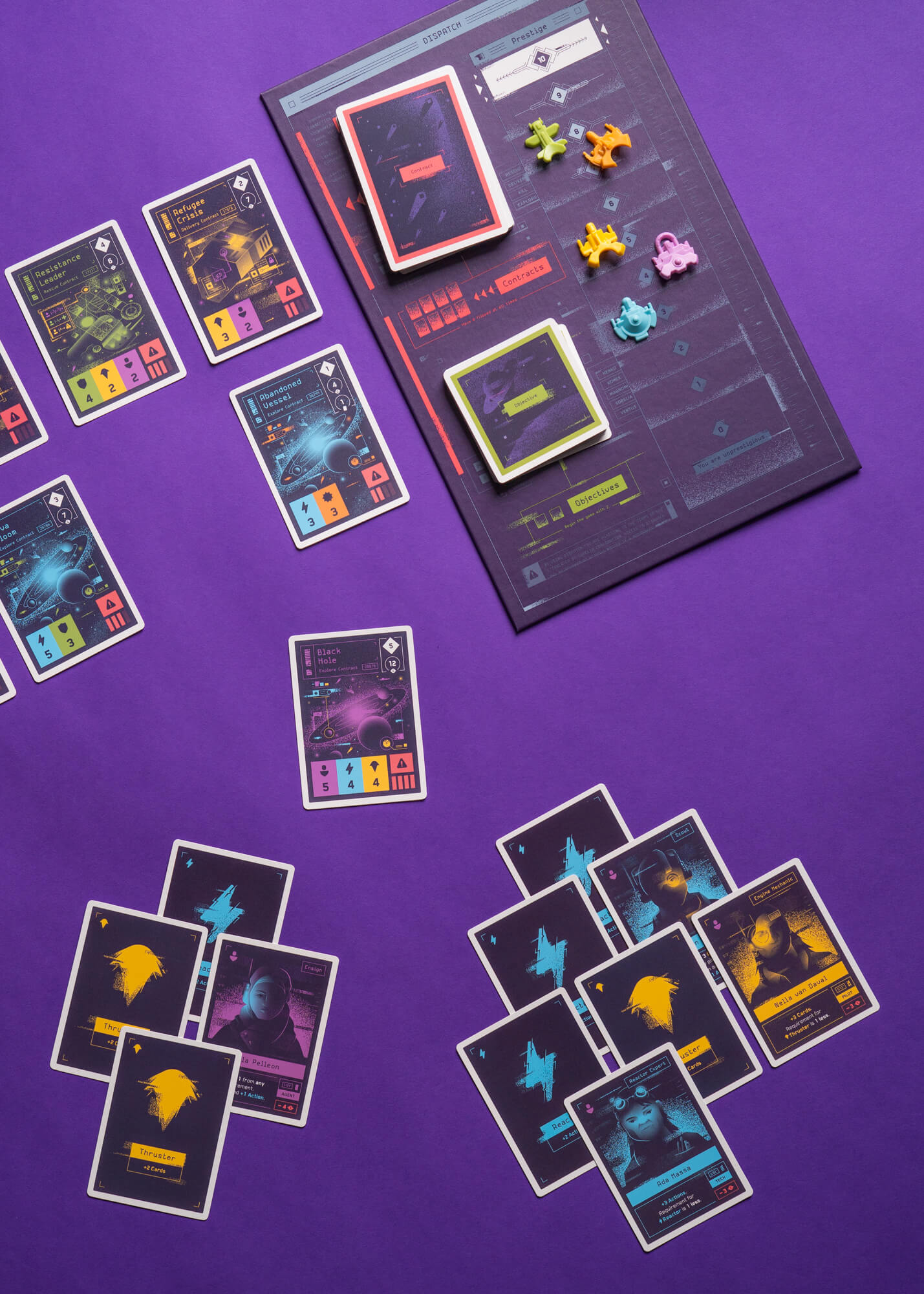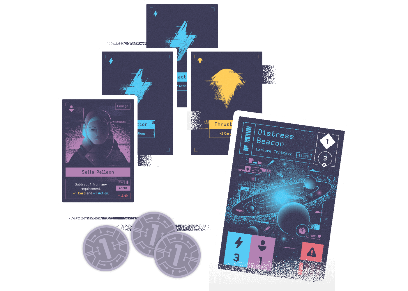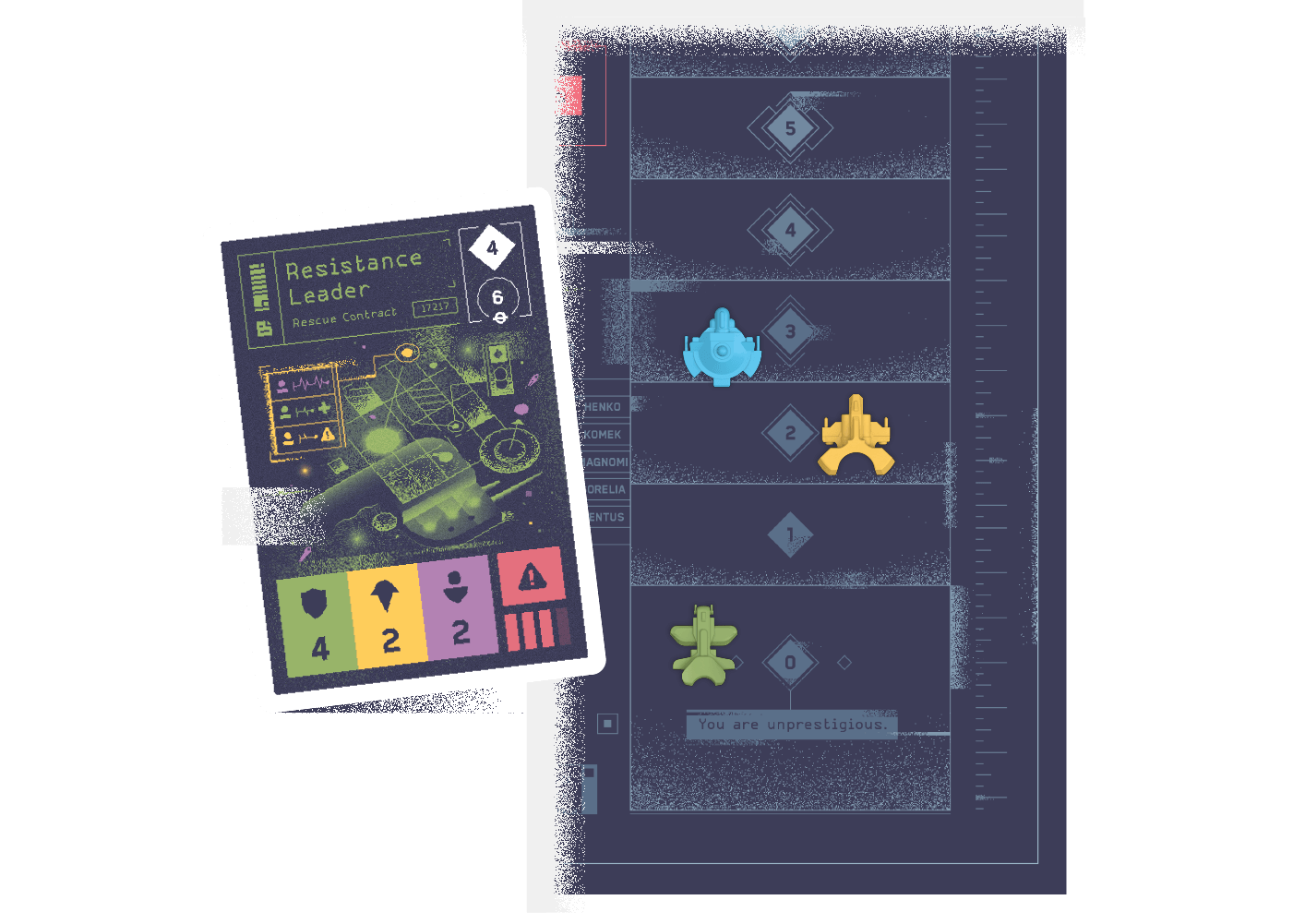 Big rewards, less risk. Negotiate a split of the rewards with your table-mates and use both of your action decks to complete the most difficult contracts. However, first to 10 prestige wins, so don't be too generous in the late game...