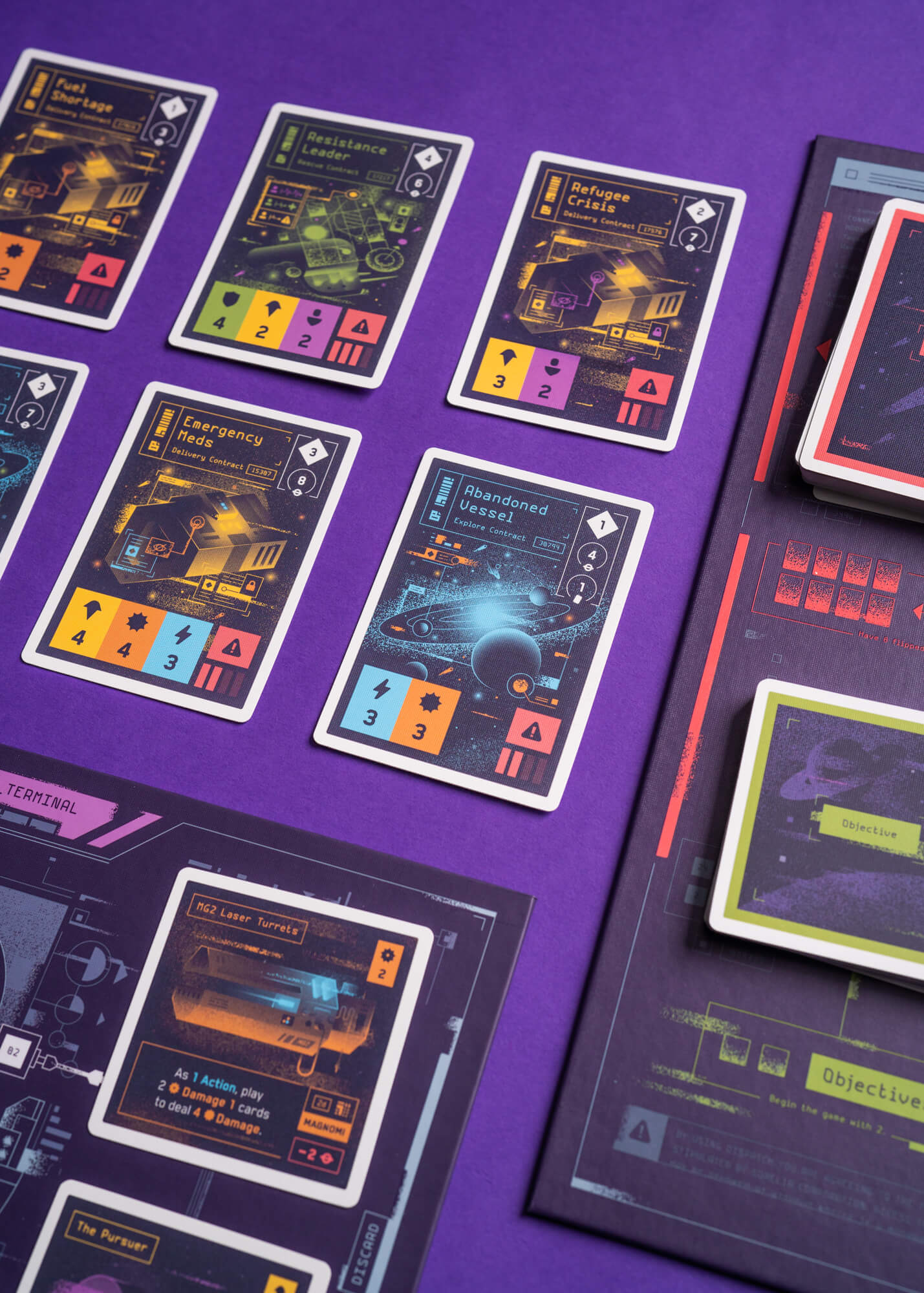 Metal coins, blackcore cardstock, custom PVC ship tokens, spot UV, silver foil, unique art on every card, wrapped boards. If it can be upgraded, it's upgraded.