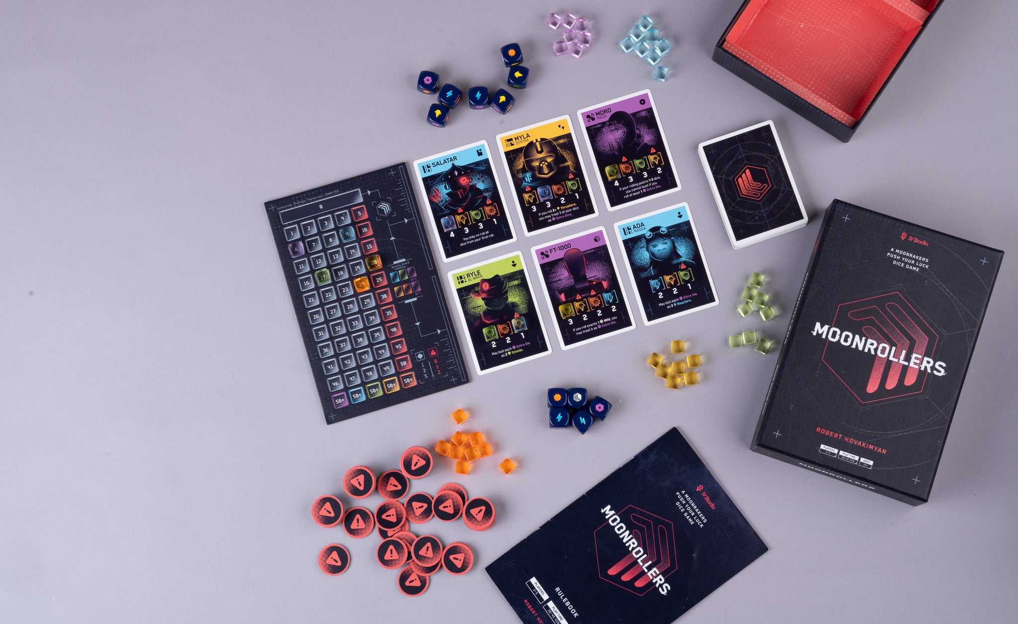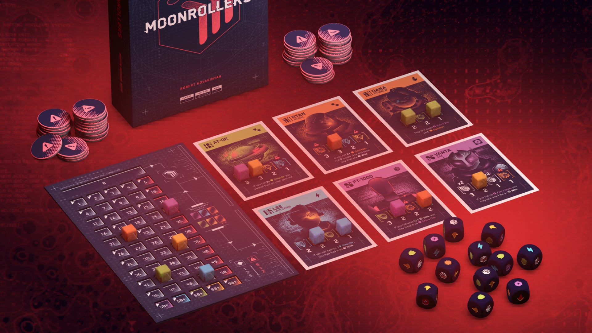 A standalone push-your-luck dice game for 2-5 players featuring familiar faces and themes from the Moonrakers universe. Attempt contracts, hire crew, and push-your-luck in an addictive game of strategy and chance. Moonrollers brings Moonraker's feelings of player interaction and calculated decision-making to a lighter experience that's the perfect appetizer for serious gamers and the star of the show for casual groups.