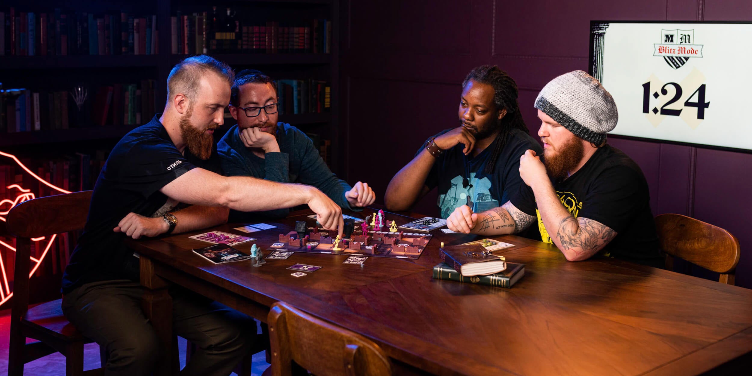 The colorful player miniatures, bookshelves, and upgrade tomes keep gameplay organized.